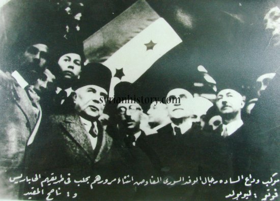 زعماء الكتلة الوطنية قبل سفرهم الى باريس للتفاوض على استقلال سورية في آذار 1936 من اليمين: سعد الله الجابري – هاشم الأتاسي – جميل مردم بك – فارس الخوري