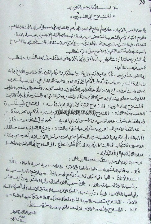 نفير الثورة السورية نداء من سلطان الأطرش لحمل السلاح ضد فرنسا لتلبية مطالب الثوار ومن بينها المجلس التأسيسي والدستور السوري